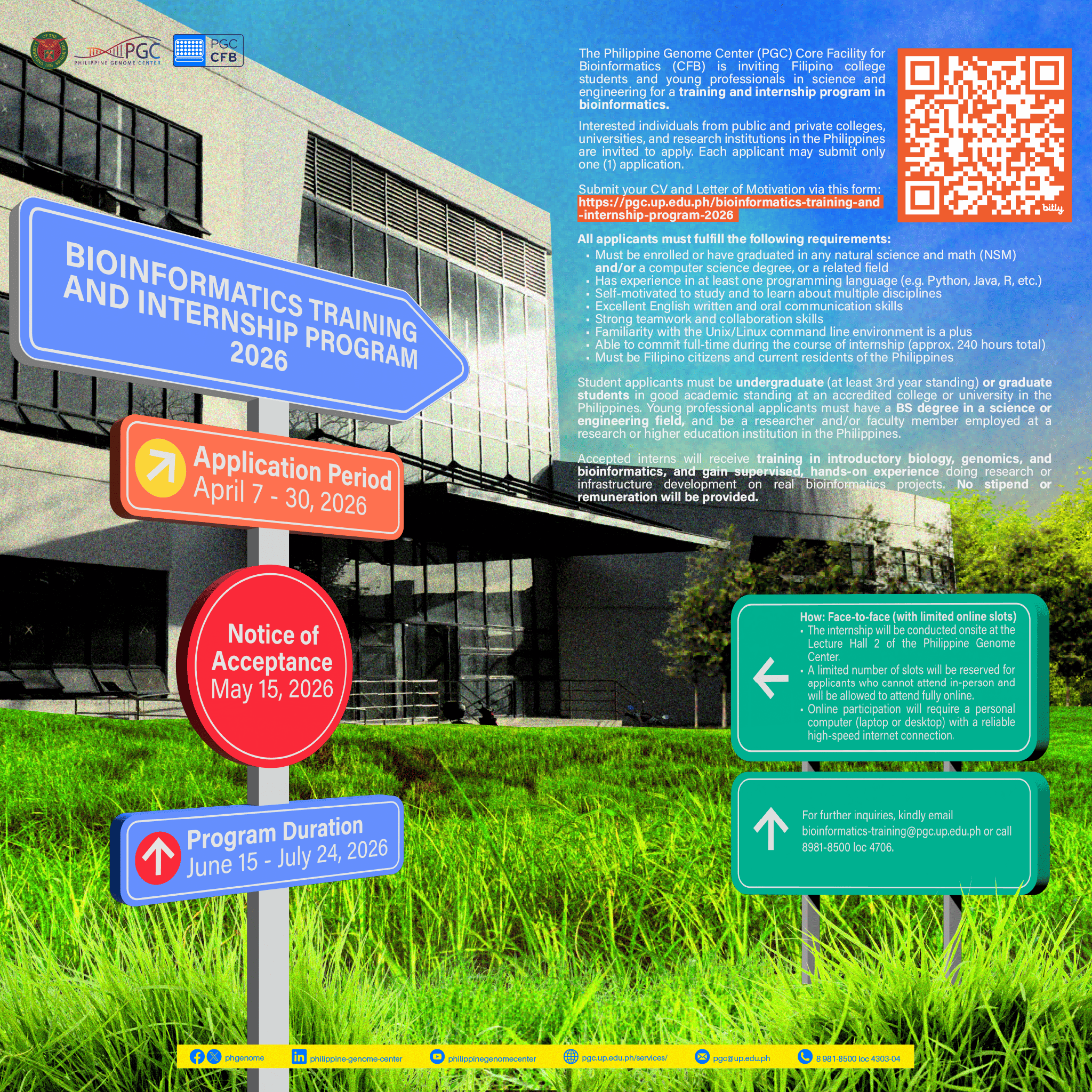 The Philippine Genome Center (PGC) Core Facility for Bioinformatics is inviting Filipino college students and young professionals in science and engineering for a training and internship program in bioinformatics. This will be held during the mid-year period from June 15 – July 24, 2026, and primarily conducted face-to-face.